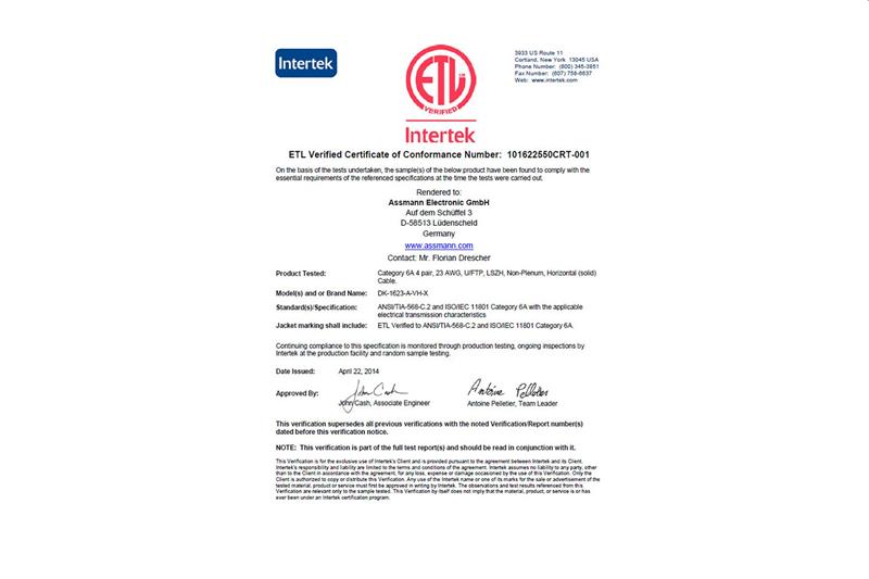 Category 6A compilant, ISO/IEC 11801, TIA/