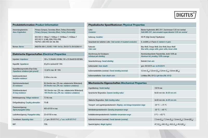DIGITUS CAT 6A U-FTP installation cable, raw, length 305 m, drum, AWG 23/1 LSZH-1, simplex, color blue