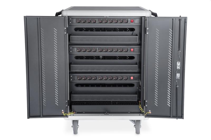 Mobilní nabíjecí skříňka od digitus® je ideálním a kompaktním řešením pro ukládání a nabíjení přenosných zařízení, jako jsou notebooky a tablety.B. Mobilní nabíjecí skříňky se často používají ve veřejných zařízeních.B školy k bezpečnému uložení zařízení na centrálním místě a k jejich nabíjení současně. Skříň obsahuje 3 řady po 10 nabíjecích stanicích, z nichž každá má na přední straně vlastní USB port. Kromě toho mohou být zařízení připojena k vestavěným zásuvkovým lištám (3 x 10násobný ochranný kontakt) na zadní straně. Díky velkorysým napájecím kabelovým posuvům a extra dlouhým regálům je zaručena optimální správa kabelů. Vestavěné ventilátory (3 x 24 V) ve spojení s větracími otvory zajišťují aktivní tepelnou diszi skříně.