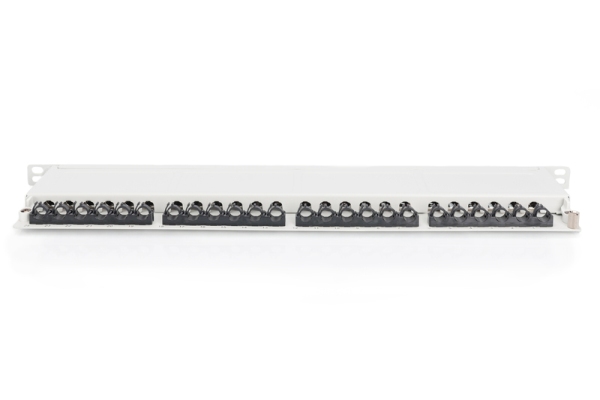 The DIGITUS® 24-port 0.5U Patch Panel offers a high density. As the panel is only 0.5U in height, it allows to present 48 ports on 1U (2 panels with 24 ports each) which can be installed.