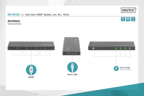 • Digitus Ultra tenký HDMI Rozbočovač, 1x4, 4K / 60Hz HDR, HDCP 2.2, 18 Gbps, Micro USB napájeno DS-45323