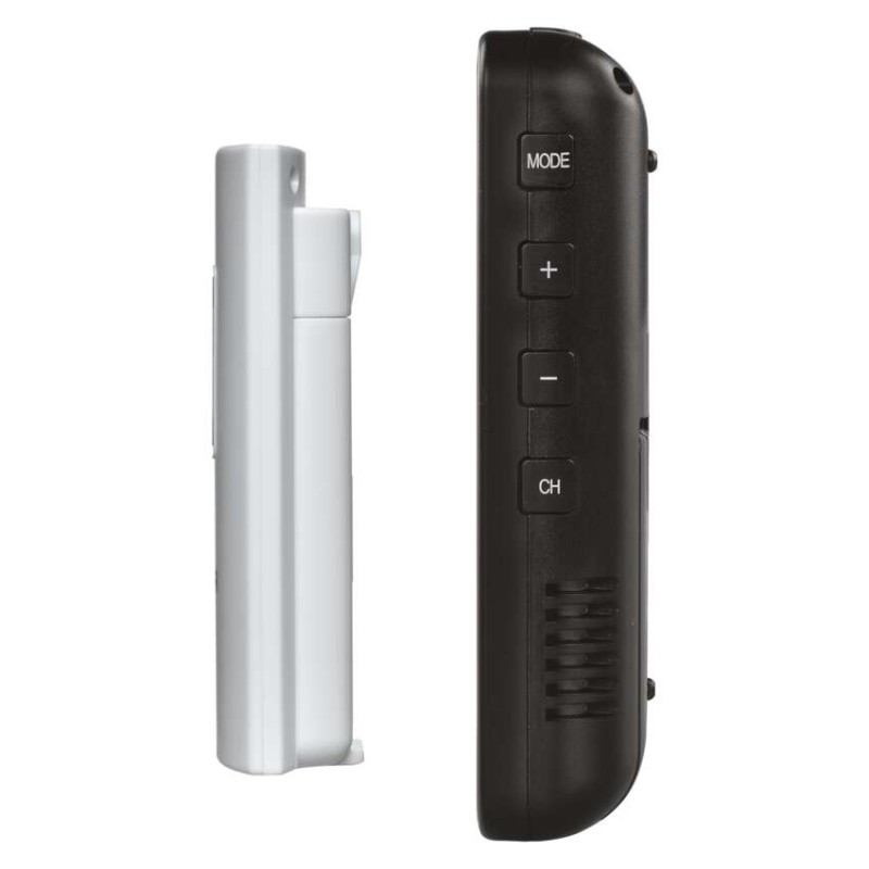 12/24 formát času: áno|anemometer: nie|barometer: áno|budík: áno, 2×|časové pásma: áno|dátum: áno|dosah snímača: až 50 m|drôtová sonda k čidlu: nie|elektronické plošné podsvietenie: áno|farebný displej (black mask) podsvietený: nie|fázy mesiaca: nie|hodiny: riadené DCF signálom|kalendár: áno|korekcia nadmorskej výšky: áno|LED podsvietenie displeja: áno|min. a max. teplota: áno|možné ďalšie čidlo: 3 (E05018)|možnosť nastavenia jednotky teploty °C/°F: °C/°F|možnosť zavesenia na stenu: áno|napájanie čidla: 2× 1,5 V AAA (nie sú súčasťou balenia)|napájanie stanice: 3× 1,5 V AA (nie sú súčasťou balenia)|opakované budenie: áno|predajný obal: 1 ks, krabička|predpoveď počasia: áno|prenosová frekvencia: 433 MHz|prevedenie teplomera: bezdrôtové|produkt: metestanica|projekcia: nie|rozmer čidla: 21 × 60 × 100 mm|rozmer hlavnej jednotky: 27 × 130 × 130 mm|sieťový adaptér: nie|teplotná výstraha: nie|trend teploty: áno|trend tlaku: áno|trvalé podsvietenie: nie|veľkosť displeja: 105 × 105 mm|vnútorná teplota: -10 °C až +50 °C, rozlíšenie 0,1 °C|vnútorná vlhkosť: 1 % až 99 % RV, rozlíšenie 1 %|vonkajšia teplota: -40 °C až +70 °C, rozlíšenie 0,1 °C|vonkajšia vlhkosť: 20 % až 95 % RV, rozlíšenie 1 %|zrážkomer: nie