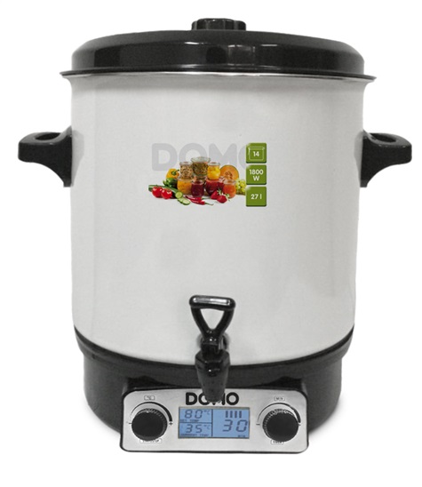 plně automatický s LCD displejem, objem 27 litrů (cca 14 - 18 sklenic), minimální množství vody cca 1 litr, přehledný podsvícený LCD displej, plynulé nastavení teploty od 30 C do 100 C, časovač 1 až 120 minut, nebo nepřetržitý chod, příkon 1800 W