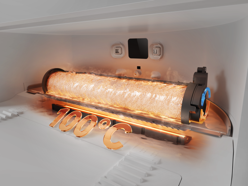 Po dôkladnom uprataní aktivuje ThermoRoller vysokoteplotné samočistiace umývanie, ktoré dosahuje až 100 °C na odstránenie zvyškov nečistôt a zápachu, pričom sa valec súčasne osviežuje.