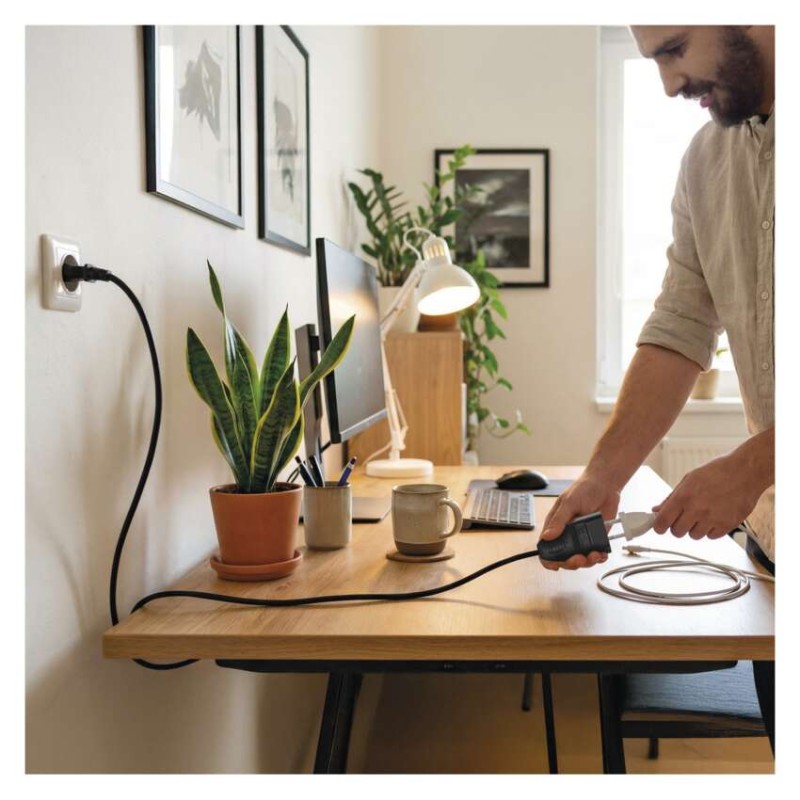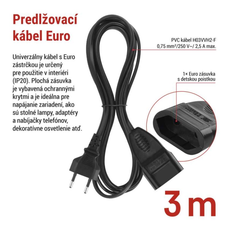 ďalšie funkcie: nie|detské clonky: áno|dĺžka: 3 m|farba: čierna|jazyky aplikácie: –|kompatibilita: –|krytie: IP20|materiál zásuvky a vidlice: plast|max. záťaž: 575 W|napätie: 250 V~|notifikácie do mobilnej aplikácie: nie|ovládanie hlasovými asistentmi: nie|počet zásuviek: 1|podporované OS: –|predajný obal: 1 ks, záves|prenosová frekvencia: –|prierez vodiča: 0,75 mm2|protokol: –|prúd: 2,5 A max.|typ izolácie: PVC|USB výstup: nie|vodič: H03VVH2-F|vypínač: nie
