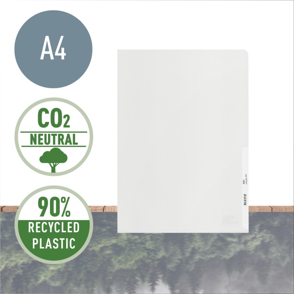 Vyrobeno z 90% recyklovaného plastu (certifikováno nezávislou ext. organizací UL), 100% recyklovatelné a CO2 neutrální L desky A4 pro přenášení, ochranu a prezentaci dokumentů. Se snadným přístupem k obsahu díky otevírání z horní a pravé strany. Odolný