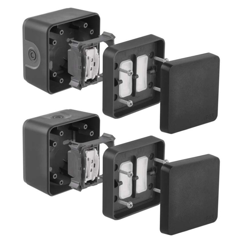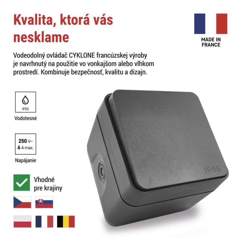 design: Cyclone|farba: sivá|krytie: IP55|napätie: 250 V~|podsvietenie: nie|predajný obal: 1 ks|prevedenie: 1 tlač. vodeodolný|produkt: ovládač zapínací (1/0)|prúd: 6 A|spôsob montáže: na stenu|typ pripojenia: automatická svorka|značka: DEBFLEX