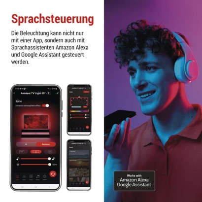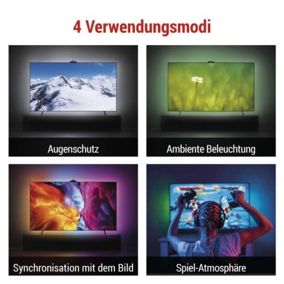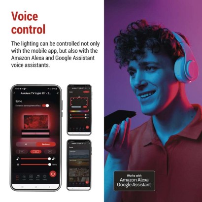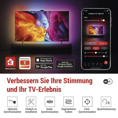 Osvetlenie GoSmart Ambient LED TV posúva zážitok zo sledovania televízora na úplne novú úroveň. Vďaka synchronizačnej kamere HD sa podsvietenie automaticky prispôsobuje farbám na obrazovke a vytvára dokonalý vizuálny efekt. Všetko ovládanie a nastavenia sa vykonávajú prostredníctvom mobilnej aplikácie EMOS GoSmart, ktorá je k dispozícii pre systémy Android aj iOS.