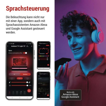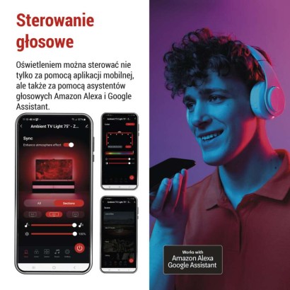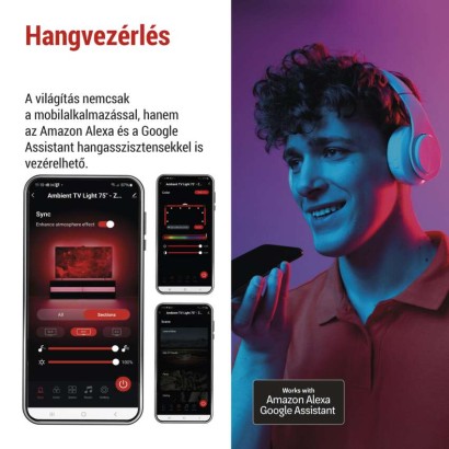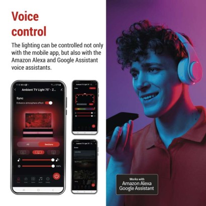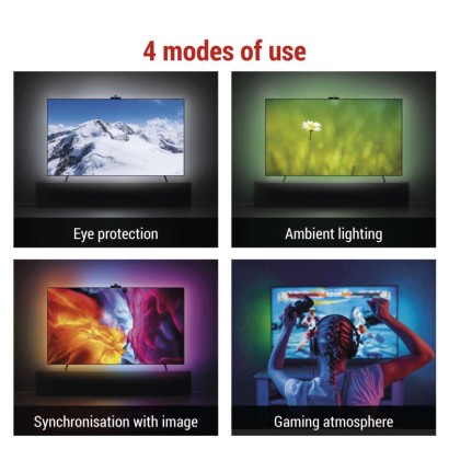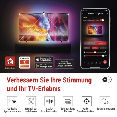 GoSmart Ambient LED TV Lighting posúva zážitok zo sledovania televízora na úplne novú úroveň. Vďaka synchronizačnej kamere HD sa podsvietenie automaticky prispôsobuje farbám na obrazovke a vytvára dokonalý vizuálny efekt. Všetko ovládanie a nastavenia sa vykonávajú prostredníctvom mobilnej aplikácie EMOS GoSmart, ktorá je k dispozícii pre systémy Android aj iOS.