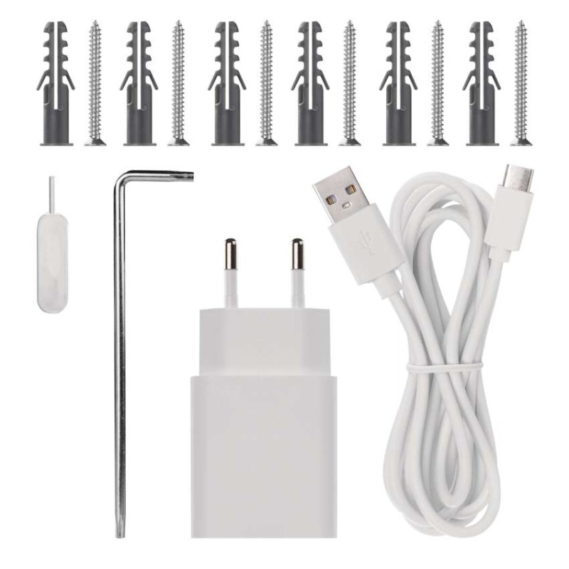 obsah balenia 1× zvonček, 1× bezdrôtový zvonček, 1× držiak, 1× sada skrutiek, 1× skrutkovač, 1× pin RESET, 1× napájací adaptér, 1× kábel USB, 3× batérie AA LR6 1,5 V, 1× manuál