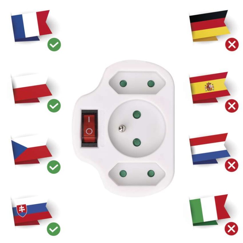 Rozbočovací zásuvka (adaptér) 3x (2x2P, 1x2P+ PE) s vypínačem
