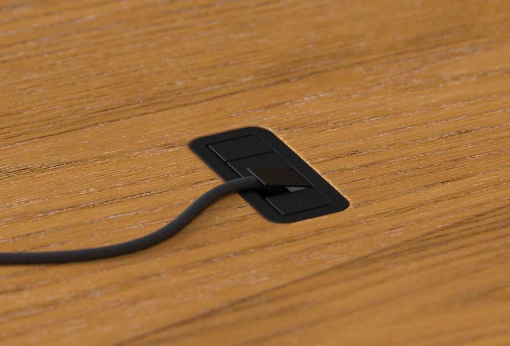 Dva pečlivě integrované pogumované průchody pro kabely jsou umístěny v jedné rovině s deskou, což usnadňuje organizaci pracovního prostoru a správu kabeláže. Na zadní hraně desky jsou přesně vyfrézované výřezy pro bezpečné uchycení držáku monitoru a vedení dalších kabelů bez poškození stěny. V kombinaci s nenápadnou policí na napájecí lištu pod stolem zůstávají všechny kabely mimo dohled a dokonale uspořádané.