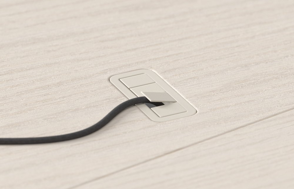 Dva pečlivě integrované pogumované průchody pro kabely jsou umístěny v jedné rovině s deskou, což usnadňuje organizaci pracovního prostoru a správu kabeláže. Na zadní hraně desky jsou přesně vyfrézované výřezy pro bezpečné uchycení držáku monitoru a vedení dalších kabelů bez poškození stěny. V kombinaci s nenápadnou policí na napájecí lištu pod stolem zůstávají všechny kabely mimo dohled a dokonale uspořádané.