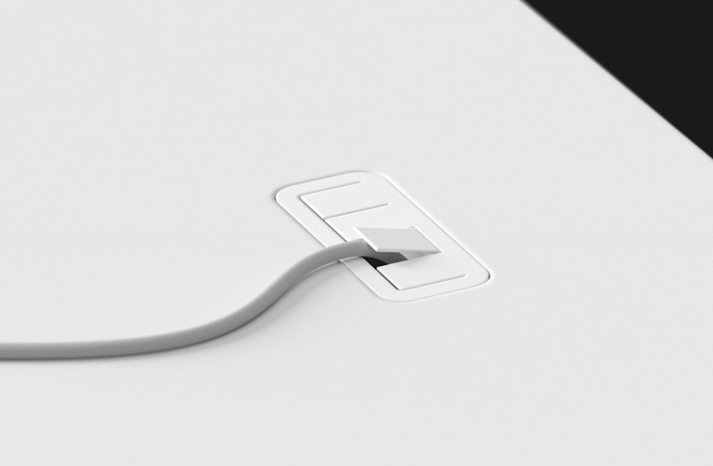 Stůl nabízí komplexní systém pro organizaci kabelů, včetně pogumované průchodky v rovině s deskou a diskrétní police na napájecí lištu. Výřez na zadní hraně umožňuje elegantní uchycení držáku monitoru bez poškození stěny.