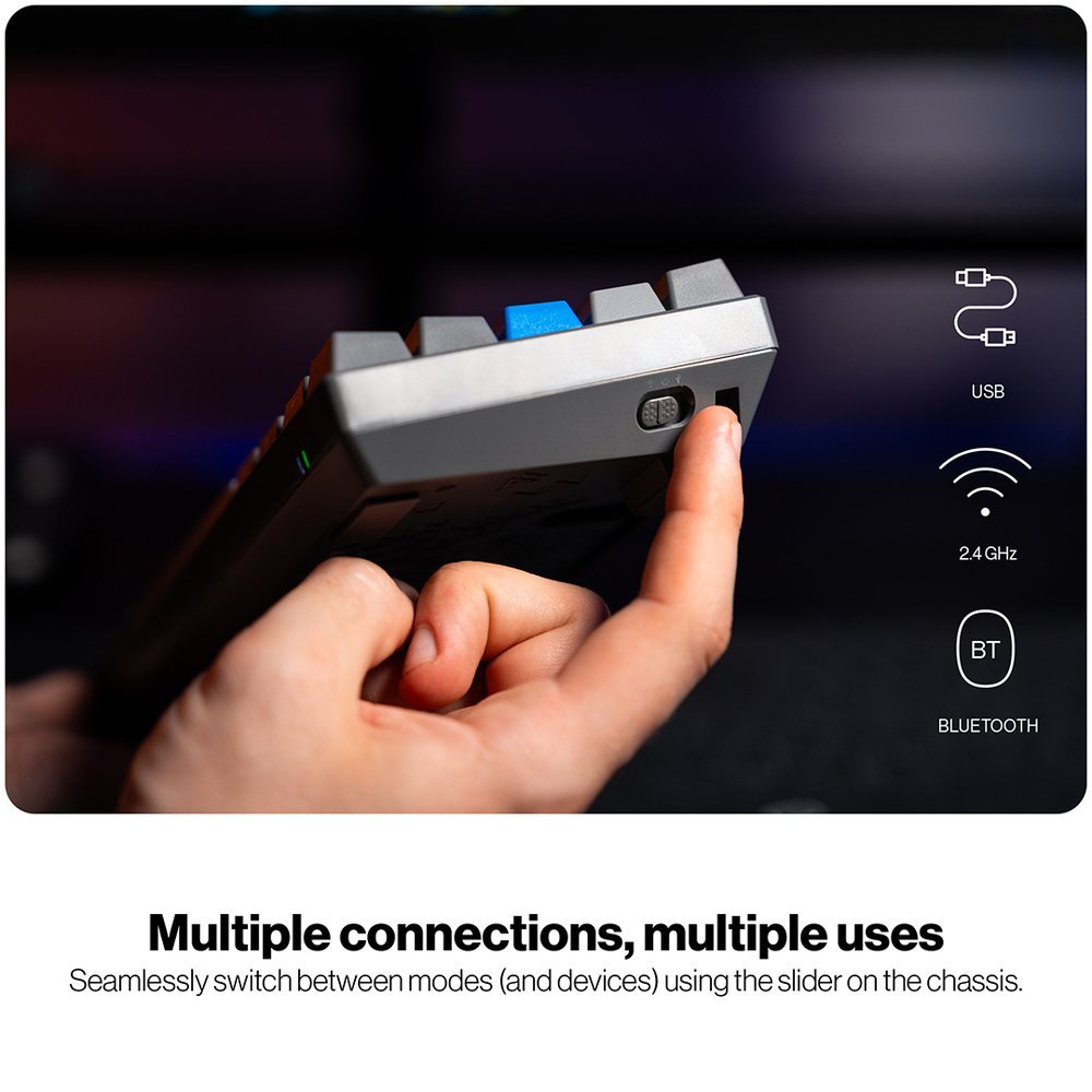 Klávesnice podporuje tři způsoby připojení – Bluetooth, 2,4GHz bezdrátový přijímač nebo USB kabel, což umožňuje snadné přepínání mezi různými zařízeními. Prémiová konstrukce s hliníkovou horní deskou a třemi vrstvami akustické pěny zajišťuje stabilní a odolnou konstrukci s vyladěnou akustikou.
