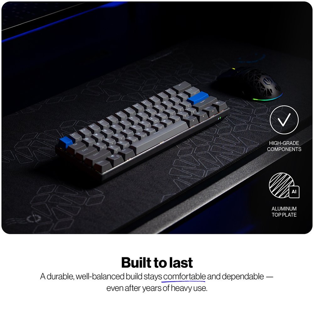 Kompaktní bezdrátová mechanická klávesnice s 60% rozložením a proprietárními spínači ENDORFY Yellow by Gateron. Trojité připojení přes Bluetooth, 2,4GHz nebo USB, hot-swap funkce, tři vrstvy akustické pěny a RGB podsvícení.