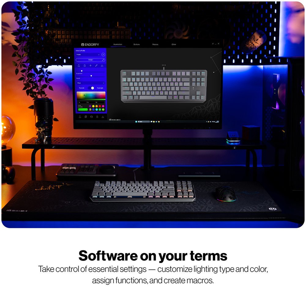Mechanická herní klávesnice s TKL rozložením a spínači ENDORFY Red. Hliníková konstrukce s třemi vrstvami akustické pěny, hot-swap podpora, RGB podsvícení a dedikovaný software pro přizpůsobení.