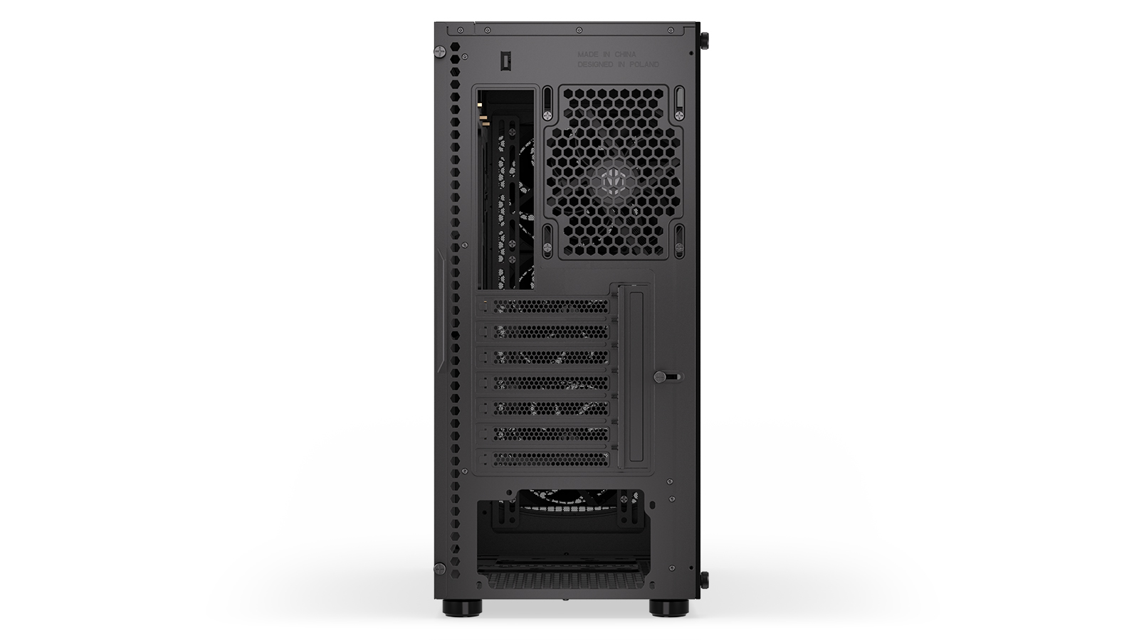 Skriňa formátu Middle Tower s priehľadnou bočnicou z tvrdeného skla ponúka dve 2,5" pozície pre SSD disky a dve 3,5" pozície pre pevné disky. Na hornej časti sa nachádzajú dva USB 3.0 porty, slúchadlový výstup a audio vstup pre mikrofón. Vybavená je štyrmi 120 mm ventilátormi, ktoré spolu s perforovaným čelným panelom zaisťujú dostatočné prúdenie vzduchu. Dômyselné riešenie umožňuje pohodlné umiestnenie až 360 mm dlhého výmenníka vodného chladenia na prednej strane. V skrini je dostatok priestoru pre chladič CPU do výšky až 162 mm a grafickú kartu s dĺžkou až 370 mm. Dodávaná je bez zdroja. Súčasťou je aj sada prachových filtrov.