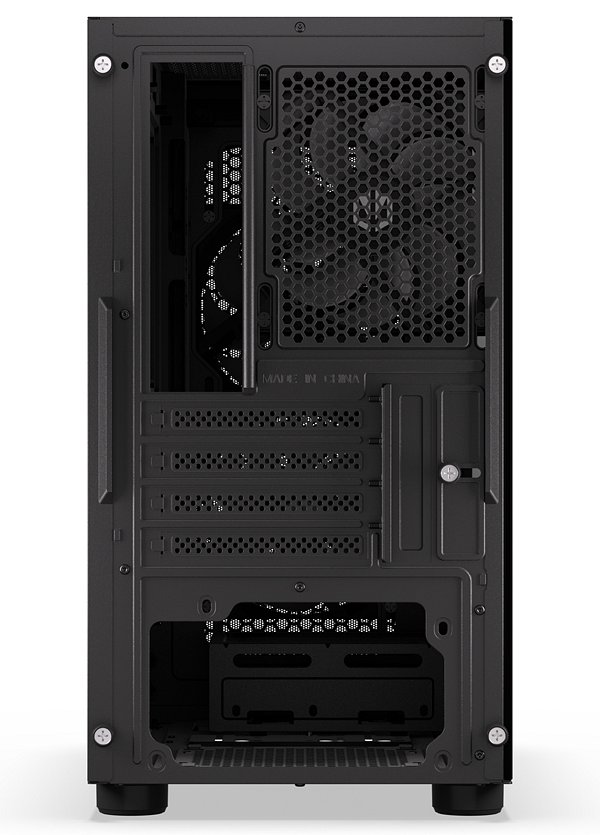 Skříň nabízí čtyři pozice pro úložná zařízení – dva 3,5" sloty pro pevné disky a dva 2,5" sloty pro SSD disky. K dispozici jsou také čtyři expanzní sloty se šroubovacími kryty pro snadnou instalaci rozšiřujících karet.