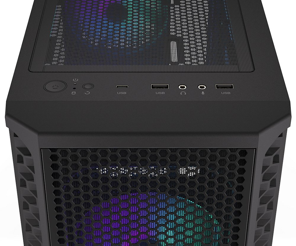 Skříň, Middle tower, microATX, bez zdroje, 2× USB 3.0, 1× USB-C, 3× 120mm ARGB ventilátor, mesh panel, bočnice z tvrzeného skla,