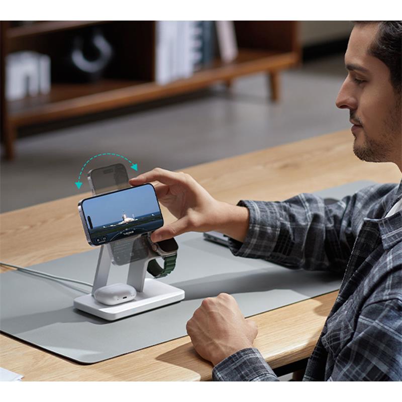 MagSafe nabíjací stojan 3-v-1 - funkčný dizajn umožňuje nabíjať iPhone, AirPods, Apple Watch - vyrobený z lesklých a matných materiálov, vďaka čomu pôsobí veľmi vkusne - rýchle nabíjanie iPhonu s výkonom až 15W a Apple Watch s výkonom 5W - MagSafe pre pevné magnetické uchytenie a presné zarovnanie - prichytenie iPhonu možné vo vertikálne aj horizontálne polohe - bezdrôtové alebo MagSafe nabíjanie - indikátor informuje o stave nabitia - špeciálna technológia chráni zariadenia pred prehriatím - kompatibilné s modelmi rady iPhone 12 a novšie, AirPods / AirPods Pro, Apple Watch - súčasťou balenia je sieťový adaptér