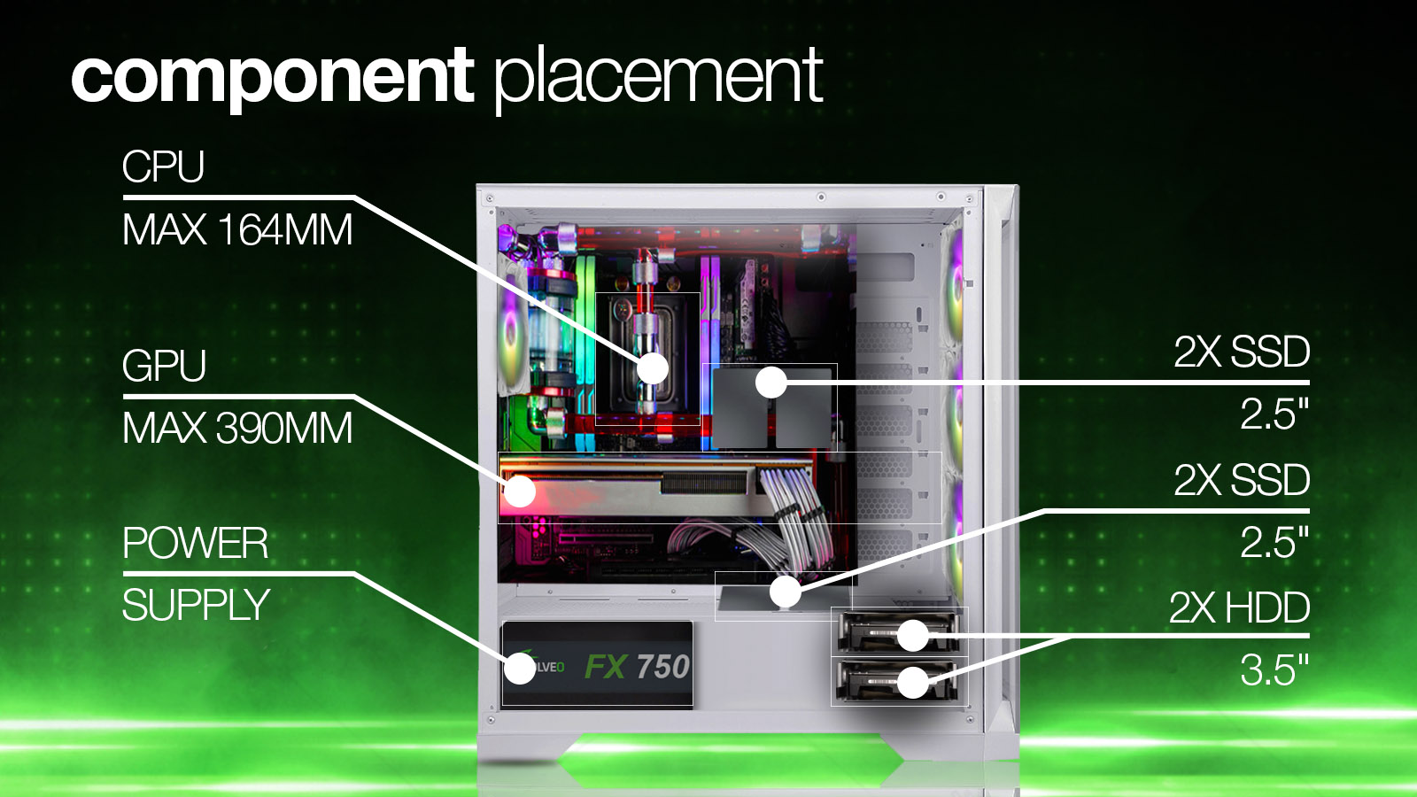 • Podpora ATX, eATX, mATX, mITX • Bočnice a čelní panel z temperovaného skla • 4x ARGB ventilátor (120 mm) • QuintFlow technologie • CPU chladič max. výška 164 mm • VGA karta max. délka 390 mm • 1x USB 3.2 Gen 1 / 2x USB 2.0 /1x HD Audio / 1x mikrofon • 2x 3,5" HDD / 3x 2,5 " SSD