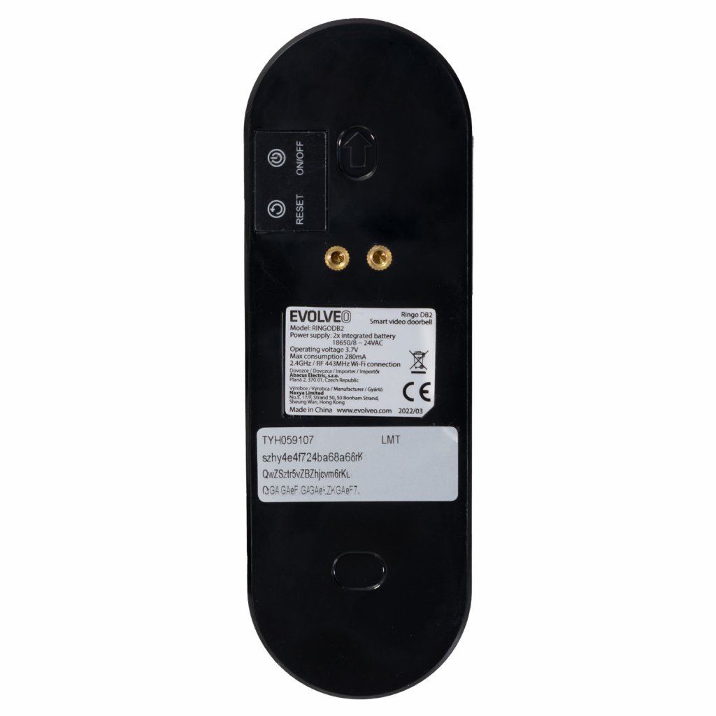 EVOLVEO Ringo DB2 - bezdrátový chytrý videozvonek + zvonek do zásuvky Ovládání pomocí mobilní aplikace pro Android a iOS Podpora chytrých asistentů Alexa a Google Assistant Voděodolnost venkovní jednotky IP65 Slot pro microSD kartu Zorný úhel kamery 130° Detekce pohybu Noční vidění Odposlech a obousměrná komunikace Montáž na stěnu Bezdrátový dveřní videozvonek s připojením k Wi-Fi Kontrola vašeho zápraží odkudkoliv. Pomocí aplikace v češtině a slovenštině pro Android a iOS budete mít přehled o všech vašich návštěvách. Pomocí svého chytrého telefonu příchozí jen zkontrolujete, nebo můžete zahájit oboustrannou komunikaci a například oznámit příchozímu svou nepřítomnost. Hlídání ve dne, v noci Díky detekci osob, zornému úhlu 130° a odesílání upozornění budete mít přehled o tom, kdo se kolem vašich dveří pohybuje. Ringo DB2 disponuje infračerveným přísvitem, prostor je tak kontrolován i v noci. V aplikaci si můžete prostor zkontrolovat v reálném čase, na dálku zapnout poplašnou sirénu, nebo zahájit hovor a potencionálního zloděje zahnat osobně. Propojení a párování Ringo DB2 prostřednictvím Wi-Fi modulu a za pomocí mobilní aplikace spárujete ke své domácí Wi-Fi síti. Párování samotné zabere jen chvíli a ovládání videozvonku pomocí aplikace je intuitivní a přehledné. Venkovní zvonek je propojen s vnitřním zvonkem do zásuvky pomocí vysokofrekvenčního modulu RF 443MHz. Není tak zapotřebí žádná dodatečná kabeláž. Instalace a nabíjení Pomocí přiložených montážních rámečků jednoduše umístíte videozvonek do požadované pozice. Díky dodávanému plochému a úhlovému montážnímu rámečku docílíte optimální instalace dle vašich potřeb. Do připevněného montážního rámečku videozvonek vložíte a upevníte jej bezpečnostním šroubkem. Ringo DB2 disponuje dvěma integrovanýma alkalickými bateriemi 18650, které na jedno nabití vydrží až půl roku. Stav baterie si můžete zkontrolovat přímo v aplikaci, nebo si zapnout upozornění na potřebu nabití. To jednoduše provedete pomocí přiloženého microUSB kabelu. Můžete také využít přiložené kabely pro napájení přímo ze sítě. Specifikace Wi-Fi chytrý videozvonek s ovládáním pomocí mobilní aplikace Smart Life (Tuya) Voděodolnost venkovní jednotky IP65 Montáž na stěnu Zorný úhel kamery 130° Detekce osob Noční vidění Odposlech a oboustranná komunikace Poplašná siréna Upozornění v mobilu při aktivaci, nebo detekci pohybu Ukládání záznamu na microSD kartu (až 128GB) nebo do Cloudového uložiště Aplikace pro mobilní telefon Smart Life pro Android a iOS v češtině a slovenštině 2x Integrovaná alkalická baterie 18650 s výdrží až 6 měsíců na jedno nabití Připojení pomocí Wi-Fi 2,4GHz / 802.11 b/g/n / RF 443MHz Zvonek do zásuvky má volitelné melodie Obsah balení EVOLVEO Ringo DB2, chytrý videozvonek Zvonek do zásuvky Uživatelský manuál Plochá montážní konzole Úhlová montážní konzole 3M samolepící montážní nálepka Nabíjecí kabel USB Malý inbusový klíč Bezpečnostní šroub 2x montážní šroub + hmoždinky 2x montážní šrouby pro úhlovou konzoli 2x připojovací vodiče pro pevnou kabeláž 2x šrouby pro připojení vodičů