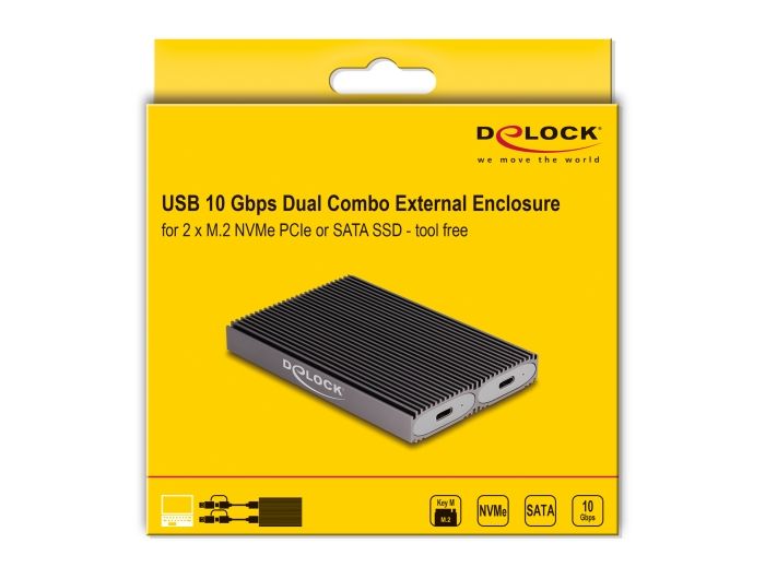 Delock - Kryt úložište - external, dual combo, toolfree - M.2 - M.2 Card (PCIe NVMe & SATA) - USB-C 3.2 (Gen 2x1) - šedáExternal USB Type-C Dual Combo Enclosur