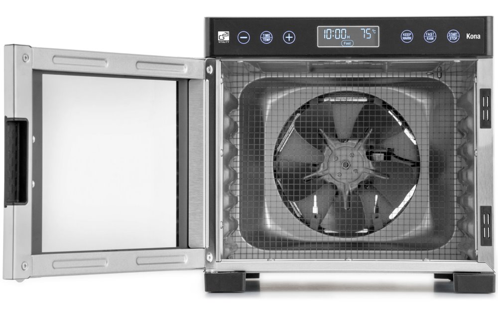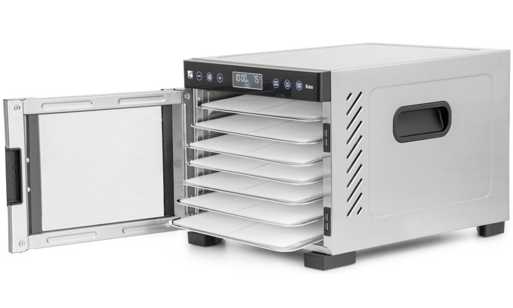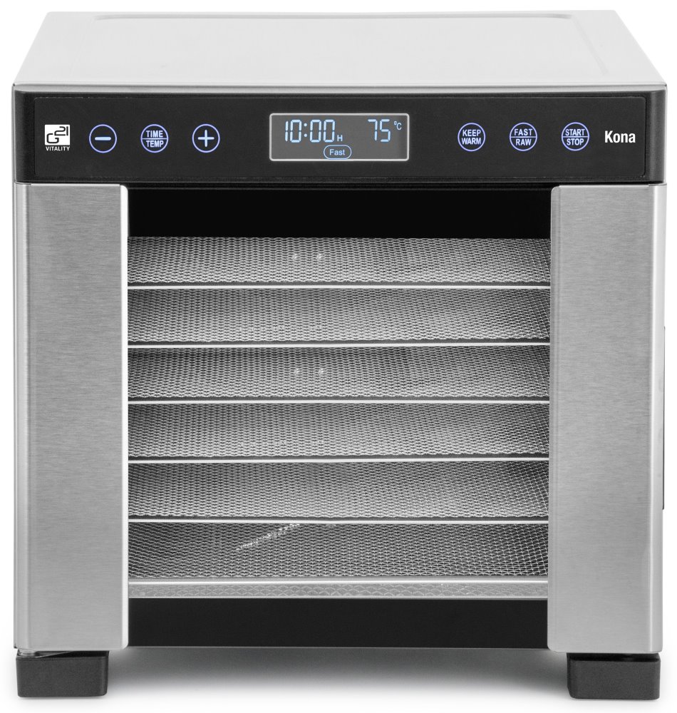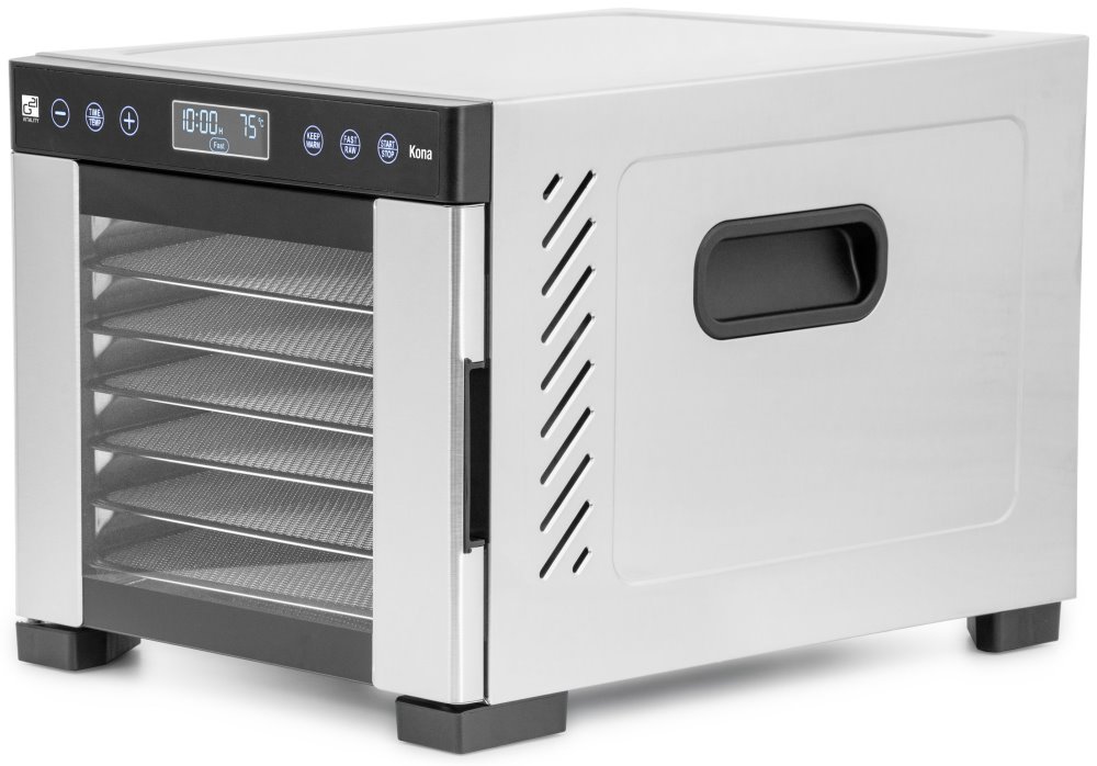 Sušička G21 Kona kombinuje kompaktní rozměry s výkonem 600 W a velkorysou sušicí plochou 4 812 cm2 rozdělenou do 7 nerezových plat. Díky horizontálnímu proudění vzduchu zajišťuje rovnoměrné sušení bez nutnosti přesouvání plat, což ji řadí o třídu výše oproti běžným sušičkám s vertikálním prouděním.