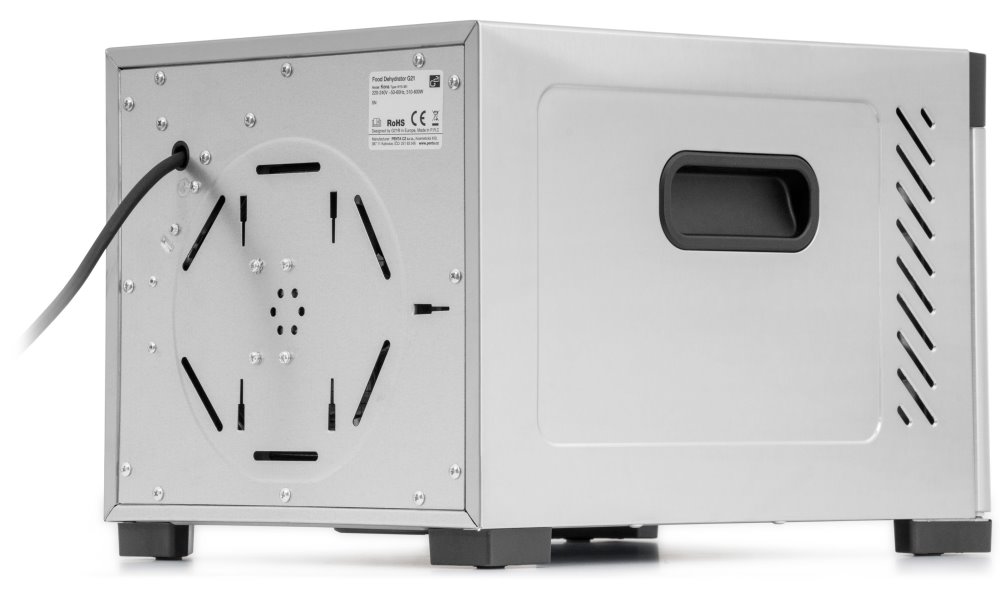 Všechny části přicházející do styku s potravinami jsou vyrobeny z nerezu, včetně vnějšího pláště, což zajišťuje snadnou údržbu a hygienické zpracování. Digitální ovládání s časovačem až 48 hodin a regulací teploty 35–75 °C umožňuje přesné nastavení pro různé druhy surovin. Průhledná dvířka s okénkem na čelní straně zajišťují kontrolu průběhu sušení a efektivní cirkulaci vzduchu.