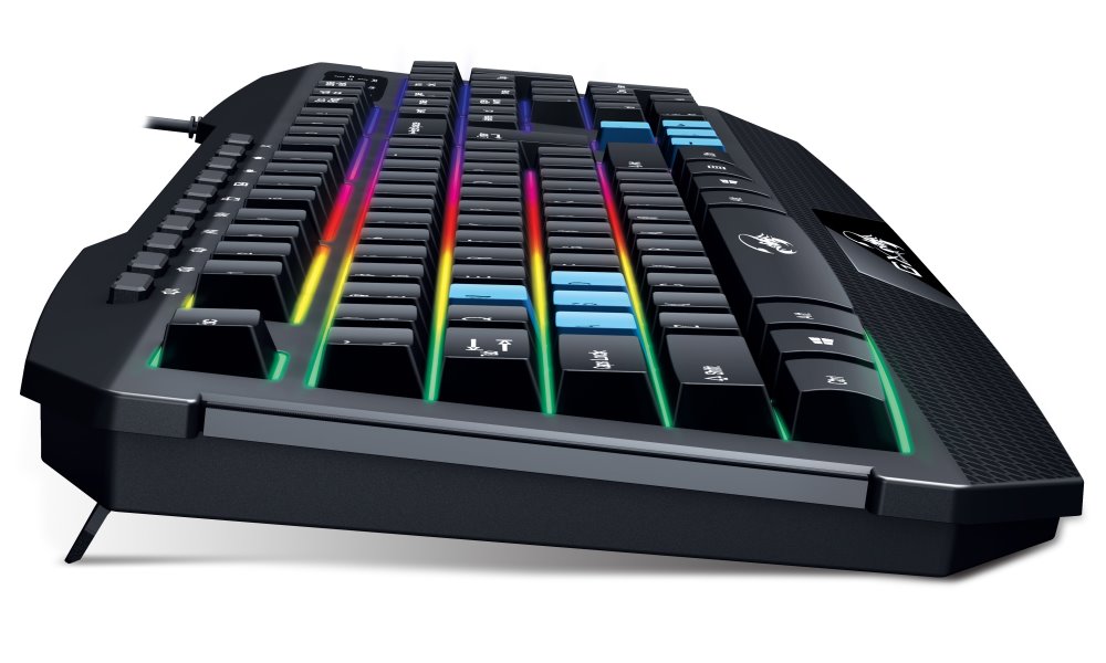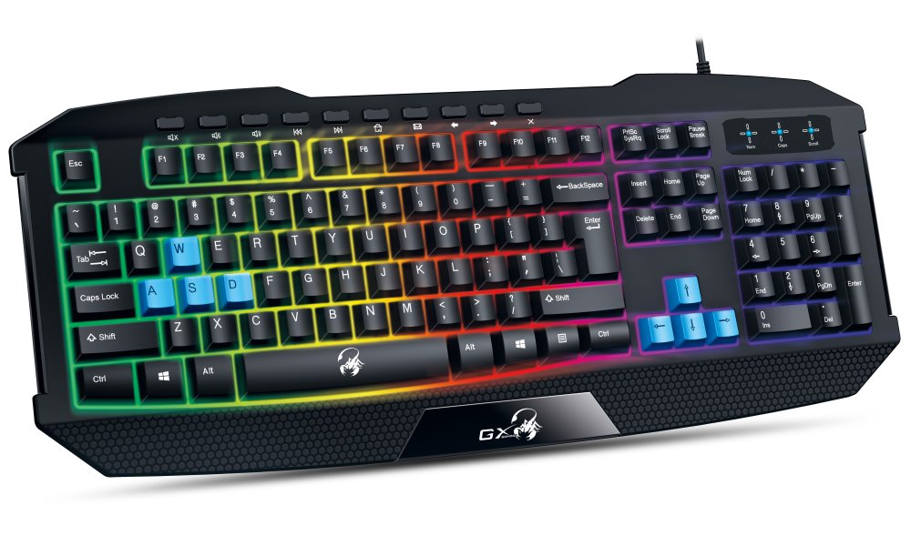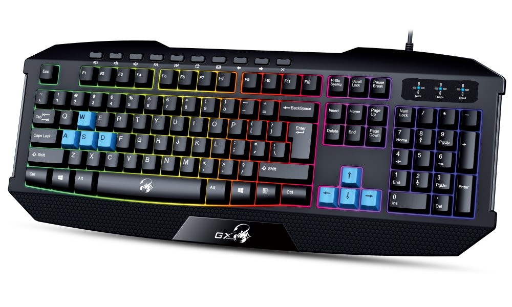 Klávesnice Genius Scorpion K215 nabízí atraktivní RGB podsvícení v 7 barevných režimech, které vytváří působivou atmosféru při hraní her i běžné práci. Díky 10 multimediálním klávesám můžete ovládat přehrávání hudby a videa, aniž byste museli opouštět hru nebo aplikaci.