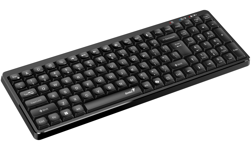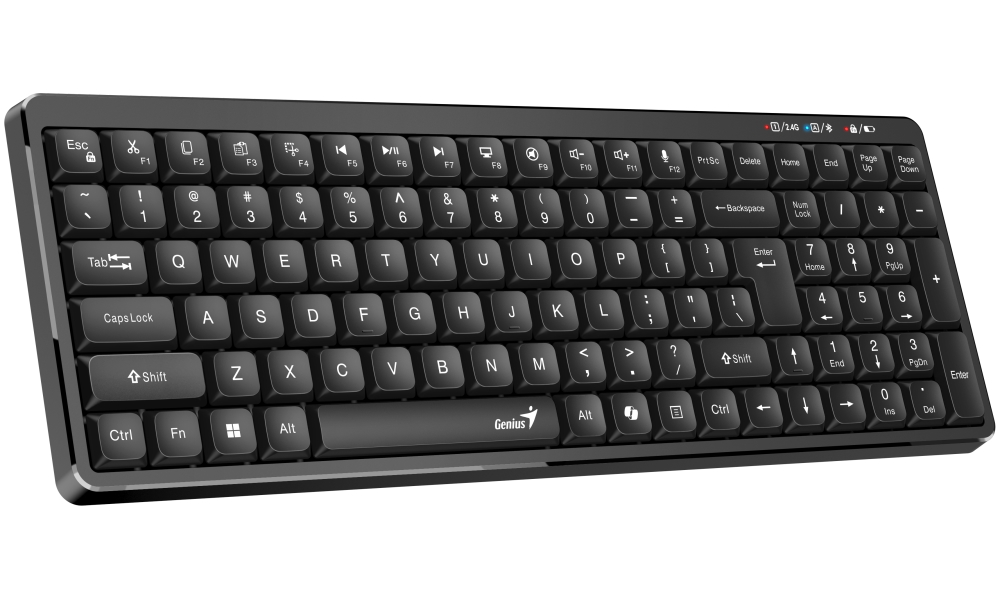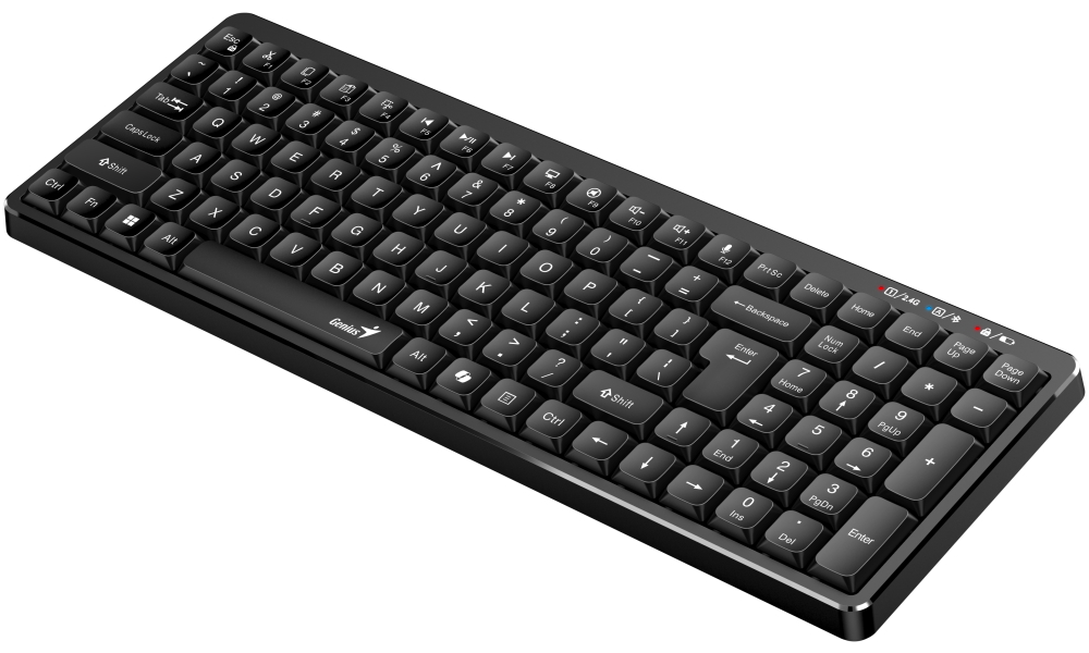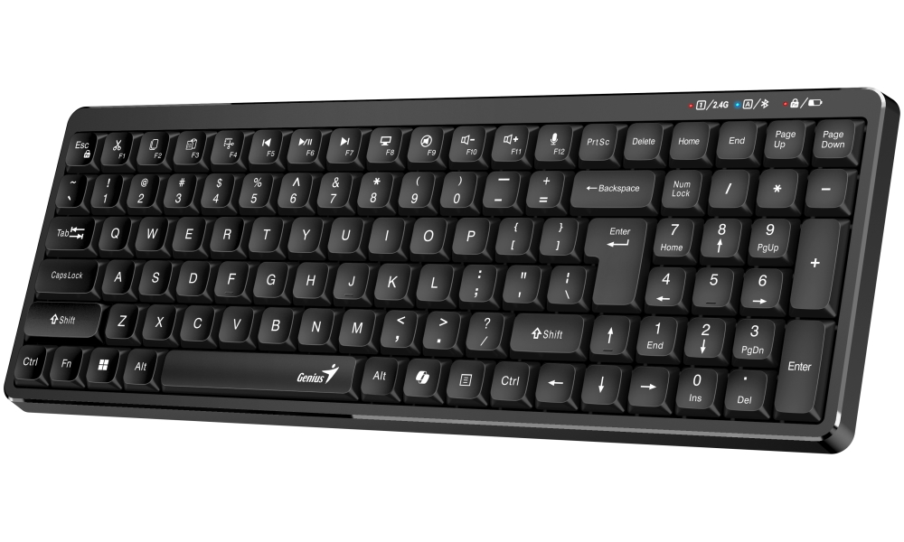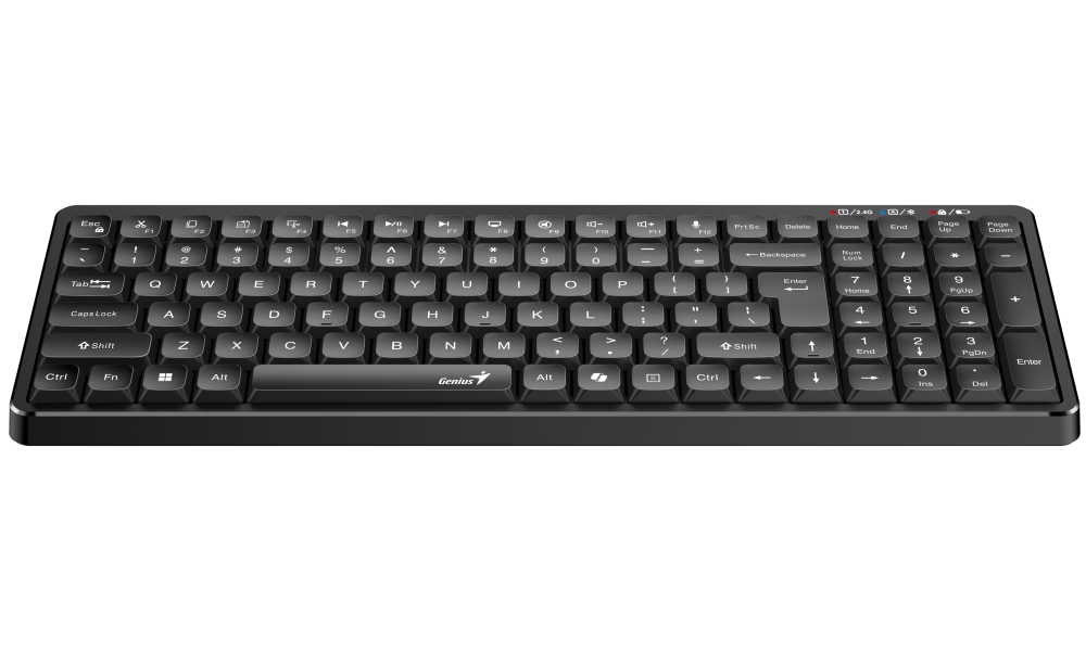 Model LuxeMate Q7100BT je prostorově úsporná bezdrátová klávesnice navržená pro efektivní práci s desktopovými počítači, notebooky, mobilními telefony, tablety i chytrými televizemi. Klávesnice nabízí dva režimy připojení – Bluetooth 5.0 a 2,4 GHz bezdrátové spojení s dodávaným USB přijímačem, s pracovním dosahem až 10 metrů.