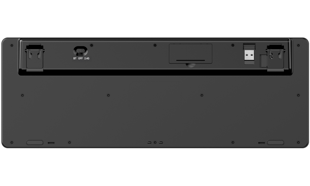 Klávesnice umožňuje přepínání mezi Bluetooth a 2,4 GHz režimem pomocí trojpolohového přepínače, který zahrnuje i polohu OFF pro úsporu baterie při delším nepoužívání. Bluetooth režim a 2,4 GHz režim nelze používat současně. Napájení zajišťují dvě AAA baterie.