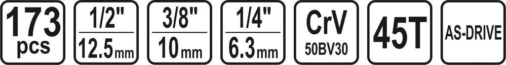 Sada značky Sthor obsahuje 173 kusů (ráčna - tři velikosti, hlavice o průměru 1/2, 3/8 a 1/4 ", bity různých tvarů a velikostí - včetně šroubováku). Kvalitní ocel, ergonomická rukojeť, praktické uspořádání v odolném kufru, funkce AS-DRIVE.