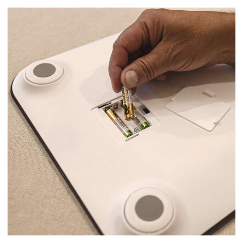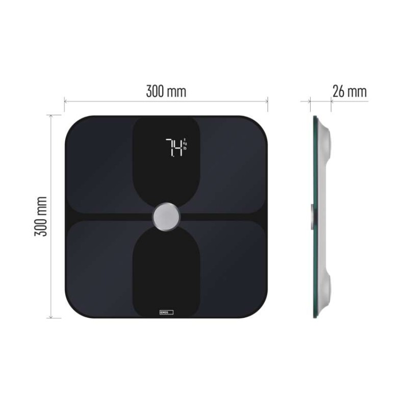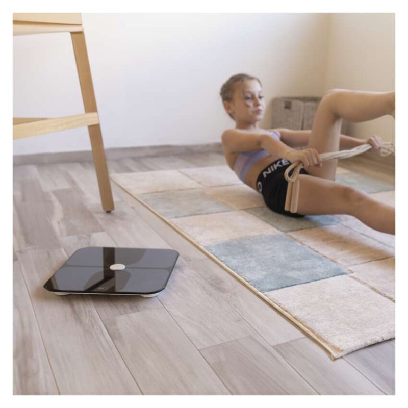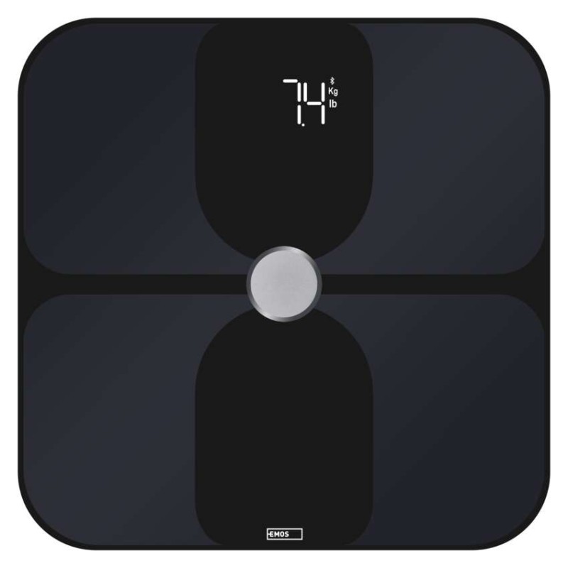 automatické vypnutie: áno|Bluetooth: áno|BMI index – meranie tuku, vody a svalovej hmoty: áno|farba: čierna|funkcia dovažovania: nie|indikácia slabých batérií: áno|indikátor preťaženia: áno|jednotky váhy: kg, lb|LCD displej: áno|max. záťaž: 180 kg|napájanie: 3× 1,5 V AAA (súčasťou balenia)|pamäť: max. 10 osôb|podsvietený displej: áno|povrch váhy: ITO tvrdené sklo|predajný obal: 1 ks, krabica|presnosť váženia: 100 g|produkt: osobná váha|rozmer: 26 × 300 × 300 mm