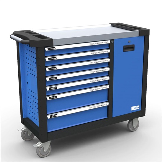 Profesionální montážní vozík, určený k převážení (ukládání) nářadí v prostorách servisních dílen, výrobních provozů apod.7 zásuvek (rozměry š x h: 530 x 400 mm, výška: 5 x 60 mm • 2 x 135 mm; vybavení: teleskopické vodicí lišty, bezpečnostní pojistky pr