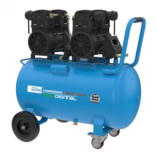 Bezolejový kompresor, určený pro (komerční) provozy a zařízení, vyžadující nehlučný chod strojů.SILENT - hladina akustického výkonu LWA: 69 dB (A), odpovídající standardům pracovního prostředí ve výzkumných laboratořích, farmacii, zdravotnictví apod.Splňuje hygienické normy pro použití v potravinářské výrobě (veřejném stravování); vhodný rovněž pro montážní práce v průmyslových podnicích.ECO DIGITAL - ovládací panel s digitálním displejem: měření tlaku ve vzdušníku; automatické spouštění (vypínání) kompresoru; regulace výstupního tlaku pomocí výběrových tlačítek.Konstrukce: dva samostatné elektromotory 1,1 kW (indukční, 1.380 ot./min, typ provozu: S1), dva dvouválcové samomazné agregáty, přímý pohon (motor/agregát na jedné hřídeli).Vybavení: 2 výstupy stlačeného vzduchu, pojistný přetlakový ventil, zpětný ventil, vzduchové filtry (4), 1,5 m síťový kabel H05 VV-F.Tlaková nádoba: 100 l, silentbloky (8), ventil pro vypouštění kondenzátu, transportní rukojeť, pojezdová (vodicí) kola.Celkové rozměry (d x š x v): 870 x 510 x 810 mm, stupeň krytí: IP 20.