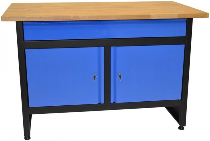 Pracovní stůl, určený k použití v domácích nebo údržbářských dílnách, montážních provozech apod.Pracovní deska (› d x š x v: 1.200 x 600 x 38 mm; spárovka z kaučukovníkového dřeva*; se sraženými hranami, povrchováúprava roztokem lněné fermeže s přís