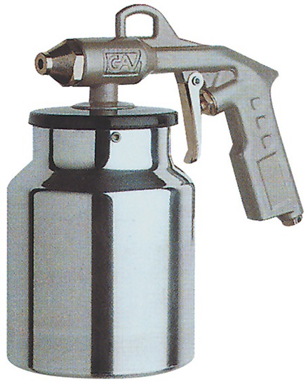 Stříkací pistole s nádobkou, určená k nanášení přípravků pro odstraňování nečistot zastudena/ochranných laků apod.(› ošetření/konzervace podvozků motorových vozidel).Konstrukce: korpus pistole/nádobka z hliníku, tryska (› průměr: 8 mm).Příslušen