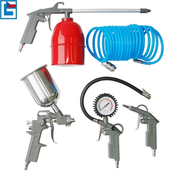5-dílná sada pneu nářadí/příslušenství, určená k běžnému použití v prostředí garáží, domácích dílen, chalup apod.(› nanášení barev-laků-ochranných hmot/plnění pneumatik/ofukování stlačeným vzduchem).Složení sady: stříkací pistole s vrchní nádobkou,