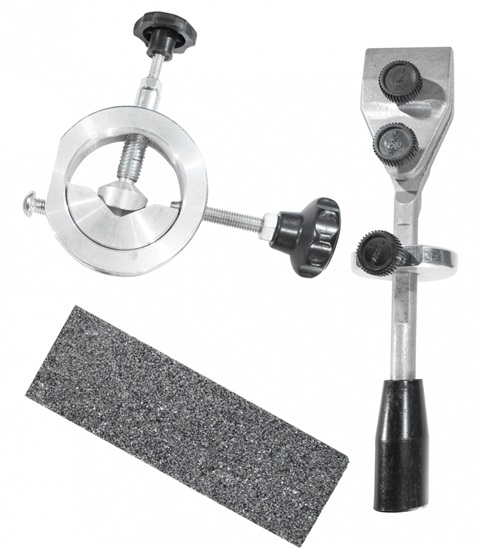 Sada brusných přípravků (2) a kamene, vhodná pro kombinovanou brusku GNS 200 VS (55247).Upínací pouzdra, určená pro přesné nabroušení nožů (s kratší čepelí) a hoblíků; brusný kámen ke srovnání korundového kotouče.