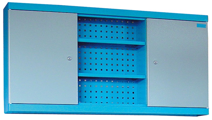 Nástěnná skříňka na nářadí, určená k využití v domácích i servisních dílnách, výrobních provozech apod.Dvoudveřová skříňka se zadním děrovaným panelem (› zavěšení nástrojů/nářadí) a odkládacími policemi.Vybavení: dvě uzamykatelné dveřové skříňky (