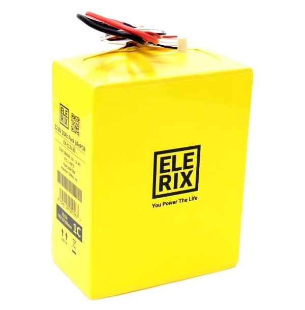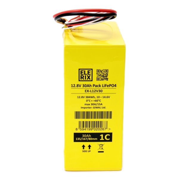 Lithiová LiFePO4 baterie ELERIX 12 V (30 Ah) s konektorem XT60 a 5pinovým vyrovnávacím konektorem (balancing). Pro dosažení vyšší kapacity doporučujeme použít články paralelně, tj. 60 Ah (2 články), 90 Ah (3 články), 120 Ah (4 články).