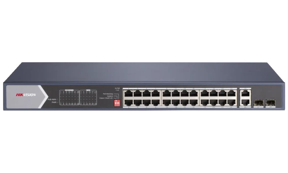 20x gigabitové PoE porty, 4x gigabitové Hi-PoE porty a 2x gigabitové optické porty, 2x gigabitové RJ45 porty
