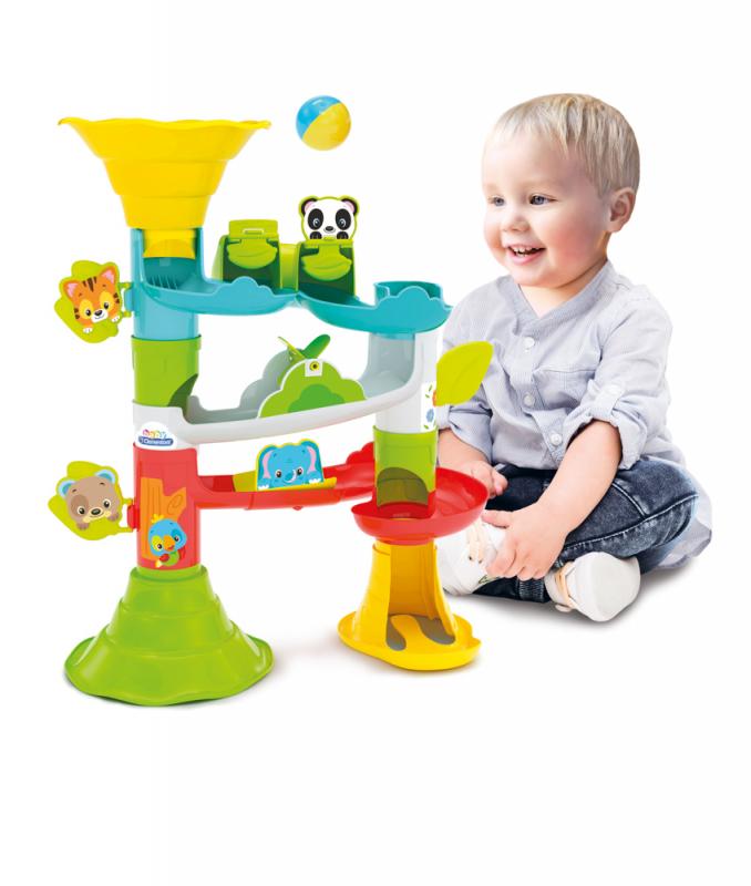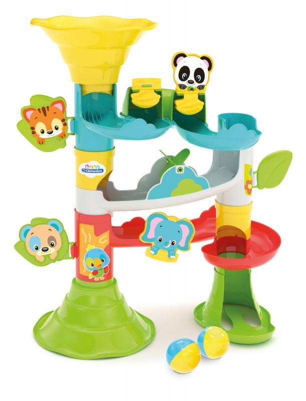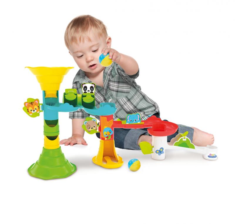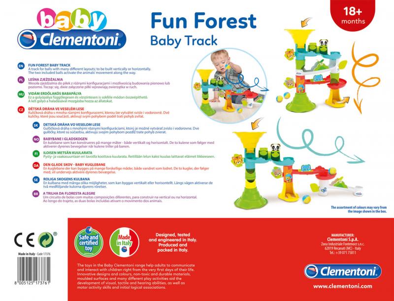 Zábavná Baby veľká guľôčková dráha so zvieratkami pre batoľatá značky Clementoni. Dráhu možno poskladať viac spôsobmi a možno tak vytvárať horizontálne a vertikálne trasy. Loptička pohybujúca sa po dráhe míňa zvieratká, ktoré vždy vtipne reagujú. Hračka stimuluje rozvoj manuálnych zručností, rozpoznávanie vzťahov medzi príčinou a následkom a vizuálne vnímanie. Dráha je vyrobená z pevného, farebného plastu a ľahko sa zostavuje. Sada obsahuje 2 guľôčky a nálepky na ozdobenie dráhy. Vyrobené v Taliansku.