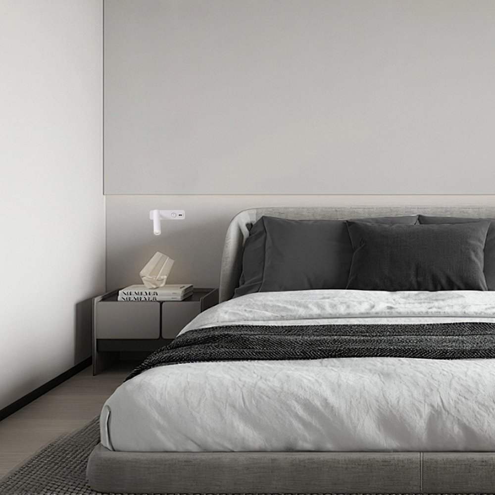 Nástěnné bodové LED svítidlo s výkonem 3 W. Disponuje válcovitou hlavou, kterou lze otáčet v rozsahu 330° a vyklápět o 90°, což umožňuje přesné zacílení tam, kde je potřeba. Mechanický kulatý vypínač umístěný na těle svítidla umožňuje jednoduché a pohodlné ovládání. Předností je také integrovaný USB port pro snadné nabíjení elektronických zařízení, což z něj činí ideální doplněk k posteli nebo pracovnímu stolu.