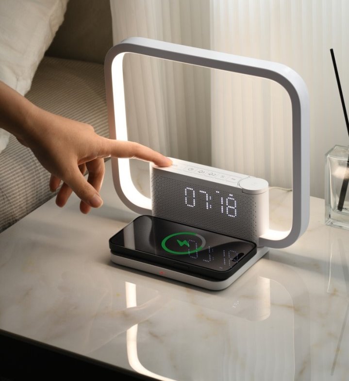Multifunkční LED stolní lampa kombinující osvětlení, budík, bezdrátové nabíjení a relaxační zvuky v jednom elegantním zařízení.
