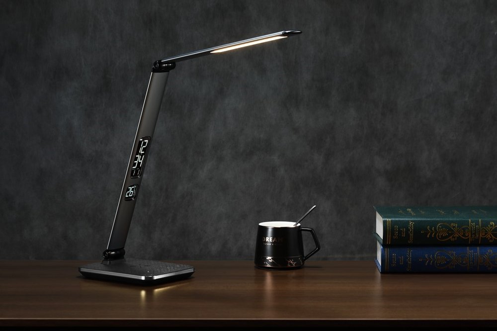 Elegantní kovová LED stolní lampička s bezdrátovým Qi nabíjením, CCT funkcí pro nastavení teploty světla, displejem s časem, datem a teplotou, stmíváním a budíkem. Ideální pro kancelář i domácí použití.