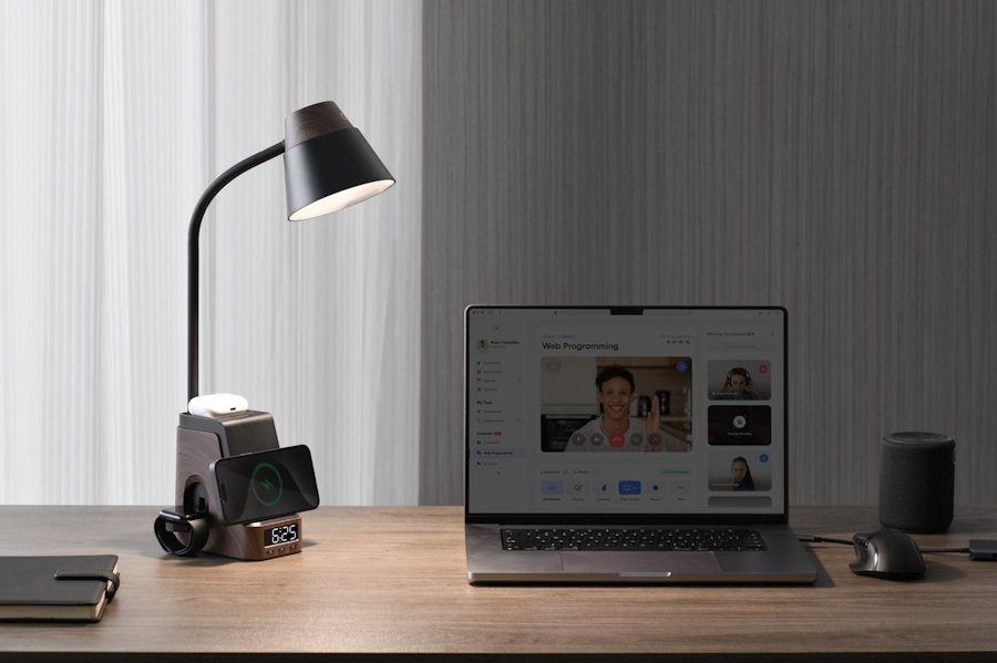 Stylová LED stolní lampa s integrovanou bezdrátovou nabíjecí stanicí Qi 3v1 pro mobilní zařízení.