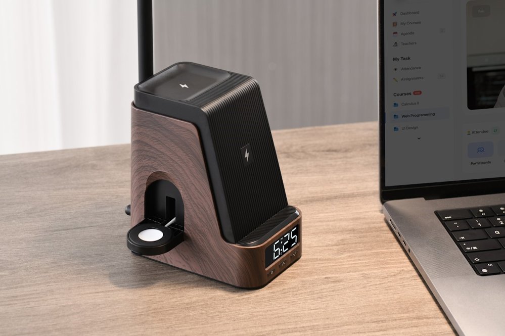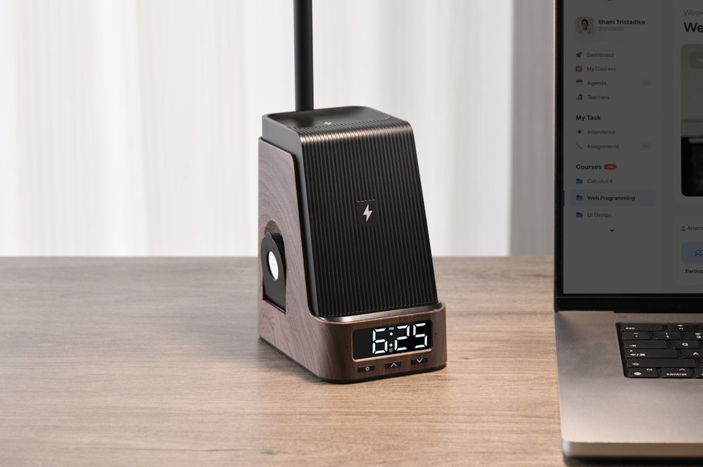 Stylová LED stolní lampa s bezdrátovou nabíjecí stanicí Qi 3v1 pro telefon, sluchátka a hodinky. LCD displej s hodinami a budíkem, stmívatelná s nastavitelnou teplotou barev CCT, elegantní dekor tmavého dřeva s černou.